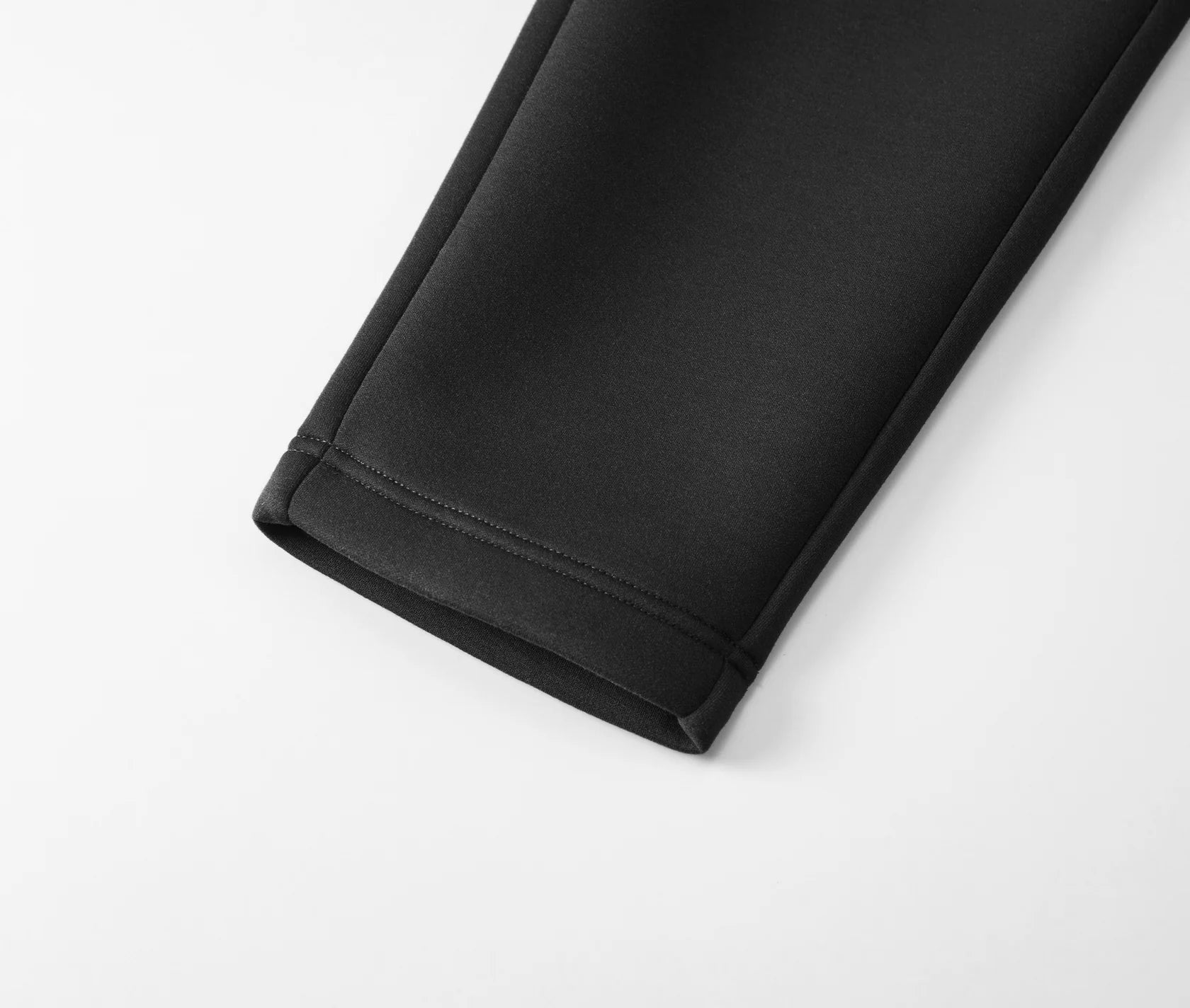 ワタリ幅は広すぎず、ゆるやかにテーパードしたすっきりとしたシルエットが動きやすさと上品さを両立しています。裾口はリブではなく2本針始末で仕上げ、スウェットパンツ特有のカジュアル感を抑えたアーバンな印象に。